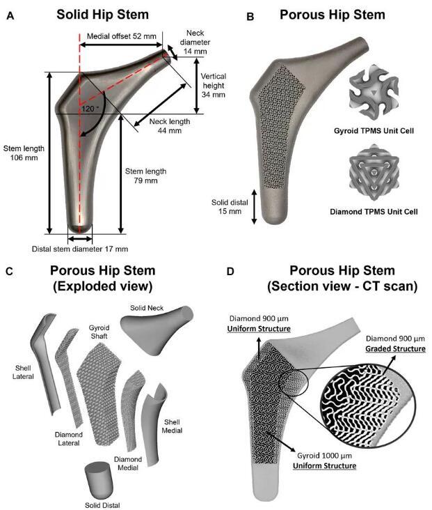 (A) 实心髋关节柄设计和尺寸。 (B) 3D 打印的多孔髋关节柄,带有陀螺仪和金刚石 TPMS 单元。 (C) 多孔髋关节柄的等距分解图。 (D) 多孔髋关节柄的显微 CT 截面图,在内侧部分具有功能分级的金刚石结构。