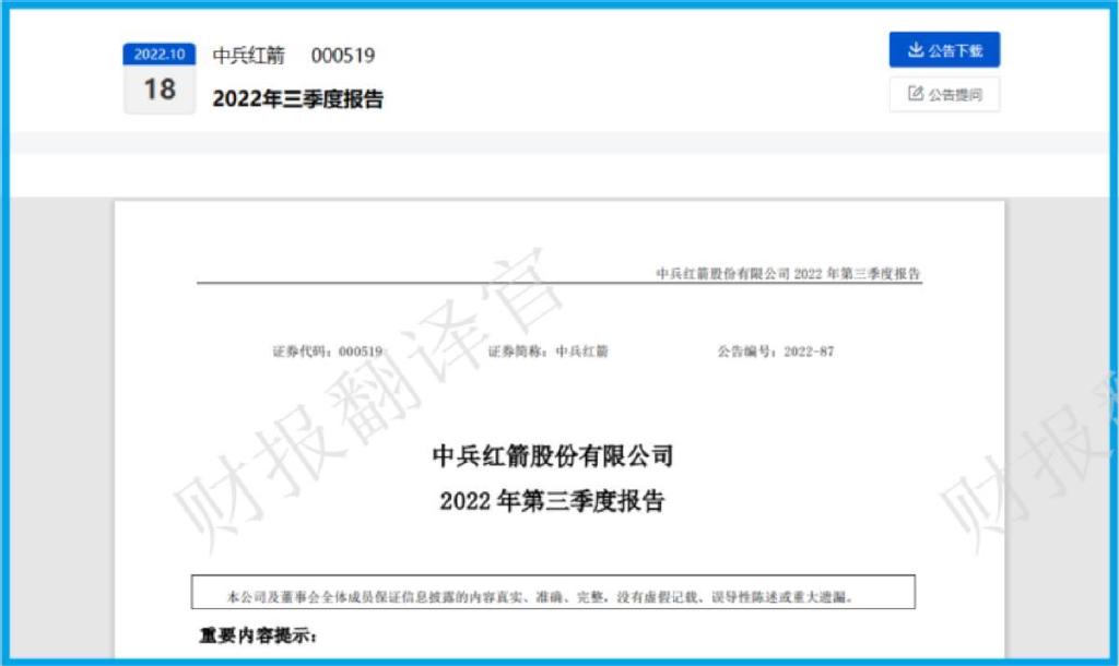 大家好我是财报翻译官,今天将调研A股培育钻石概念板块中,中兵红箭(股票代码:000519)这家上市公司2022年第三季度财报,下面进入今天的主题。