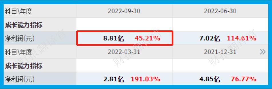 2021年第三季度,这家公司的净利润只有6.07亿元。到了2022年第三季度,该企业的净利润就达到了8.81亿元,同比增长了45%。