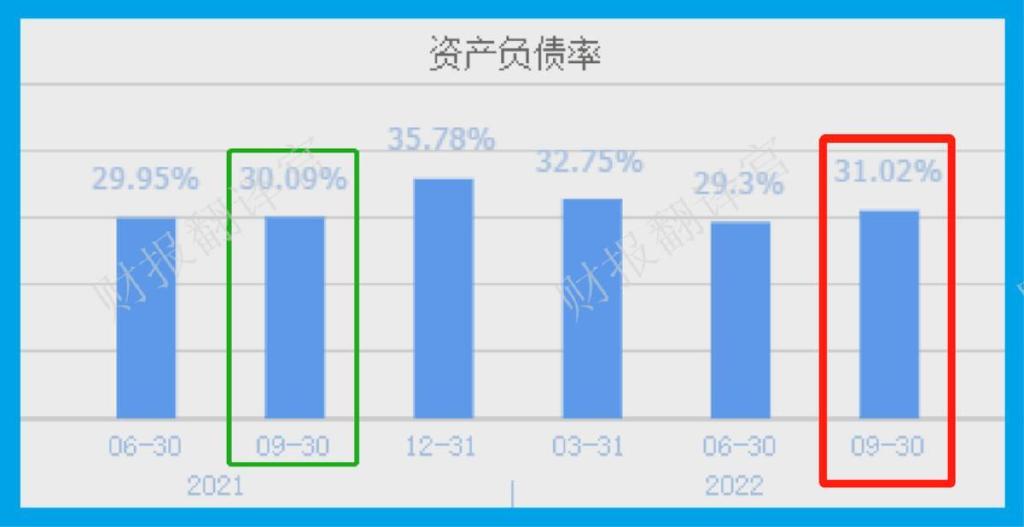 2021年第三季度,该企业100元的资产里只有30.09元是借来的,资产负债率为30.09%。而到了2022年第三季度,这家公司的资产负债率就达到了31.02%,同比增长了3%。
