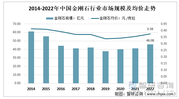 工业金刚石早期由欧美等国家垄断,产品价格居高不下,可达 100 美元/克拉;中南钻石于 2001年通过自主研发突破了关键粉末触媒技术,开启了金刚石快速发展道路,产品因产量大幅提升价格快速下降,2020年起,受光伏、消费电子、新能源汽车制造等高端制造领域快速增长需求,以及培育钻石对工业金刚石带来的产能挤压,工业金刚石供不应求,后续有望维持高位甚至进一步上升。2022年我国金刚石行业市场规模约46.08亿元,同比增长12.04%,市场均价总体呈波动增长趋势,2022年均价约0.38元/克拉。