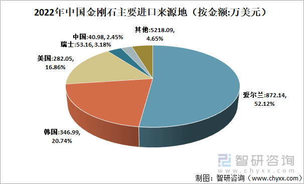 从进口来源地看,我国金刚石主要从爱尔兰、韩国、美国等地进口。2022年,我国从爱尔兰进口金刚石872.14万美元,占总进口金额的比重为52.12%。从韩国进口金刚石346.99万美元,占总进口额的20.74%,位居第二。2022年,我国金刚石进口主要来源如下: