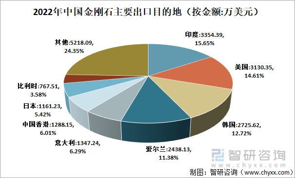 从出口目的地看,我国金刚石主要出口至印度、美国、韩国、爱尔兰等地。2022年,我国对印度出口金刚石3354.39万美元,占总出口金额的比重为15.65%;对美国出口3130.35万美元,占总出口金额的比重为14.61%。2022年,我国金刚石出口主要流向如下: