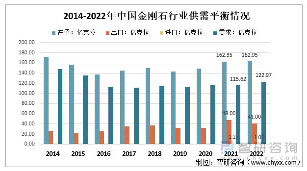 从产品供需来看,2021年我国金刚石行业产量162.35亿克拉,进口量1.27亿克拉,出口量48亿克拉,国内金刚石行业需求量115.62亿克拉。2022年金刚石产量增加至162.95亿克拉,进出口量分别下降到1.02亿克拉、41亿克拉,国内金刚石行业需求量约122.97亿克拉。