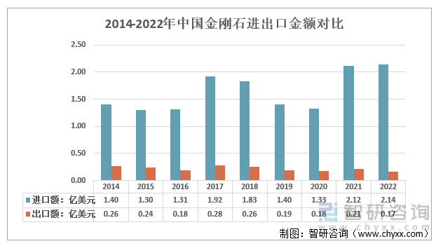 我国金刚石以出口为主,且近年来出口金额呈波动增长态势。2022年我国金刚石出口金额为2.14亿美元。同比增长1.22%;进口金额为0.17亿美元,同比下降21.15%。