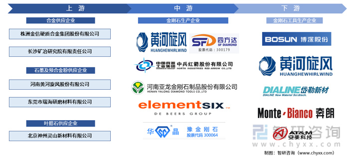 金刚石产业链中,上游参与主体主要涉及合金、石墨、预合金粉及叶腊石供应企业;中游企业主要涉及人造金刚石单晶的合成、PDC聚晶复合片(包括微粉)及聚晶的生产。金刚石下游是各种各样金刚石刀具、钻头、磨具、线锯、锯片、拉丝模等金刚石工具生产企业。