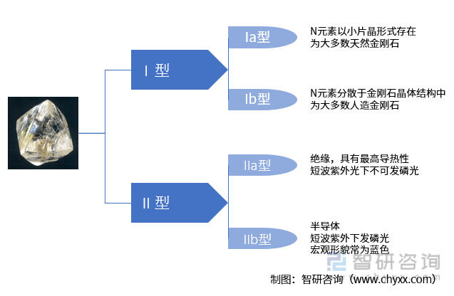 金刚石常根据其含氮量及光谱特征分类,分为I型和II型两大类,进一步细分为Ia、Ib型和IIa、IIb型。由于金刚石的颜色受控于晶体内部的杂质元素以及晶格缺陷,金刚石的类型往往与颜色密切相关,例如天然的Ia型金刚石通常为无色,棕色,粉色或者紫罗兰色;天然的Ib型金刚石通常为棕色,黄色或者橙色;天然的IIb型金刚石通常为天蓝色。