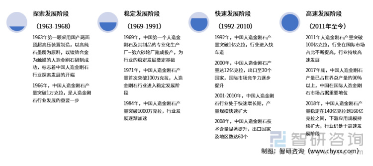 中国金刚石行业起步较晚,行业发展速度较快。目前中国金刚石制造设备科技含量、金刚石里克拉数及金刚石价格在全球具有竞争优势。中国金刚石行业发展至今主要经历了探索发展阶段、稳定发展阶段、快速发展阶段和高速发展阶段。