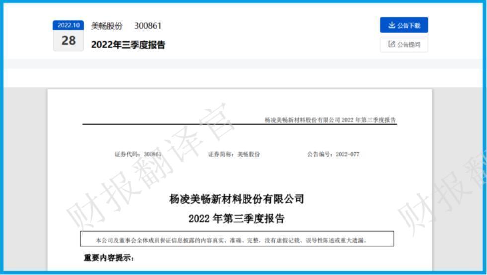 大家好我是财报翻译官,今天将调研A股光伏概念板块中,美畅股份(股票代码:300861)这家上市企业2022年第三季度财报,下面进入今天的主题。